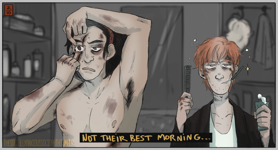 You had fun with day 1 ? Now let’s get FEELS for @huxloween day 2 : makeup and wig ! They sure are gonna need a lot of makeup to cover all those bruises… Kylo putting on eyeliner, as the good goth kid he is and Hux is doing his hair coz hhhh wig I guess ?